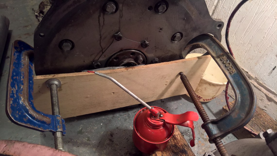 If i could stand the engine up on end then it would be easy!….but not really possible. After cleaning the bearing with some turps i mackled up a piece of wood held in place with a couple of g clamps and a piece of old inner tube to form a seal. A small gap at the top to put oil in.