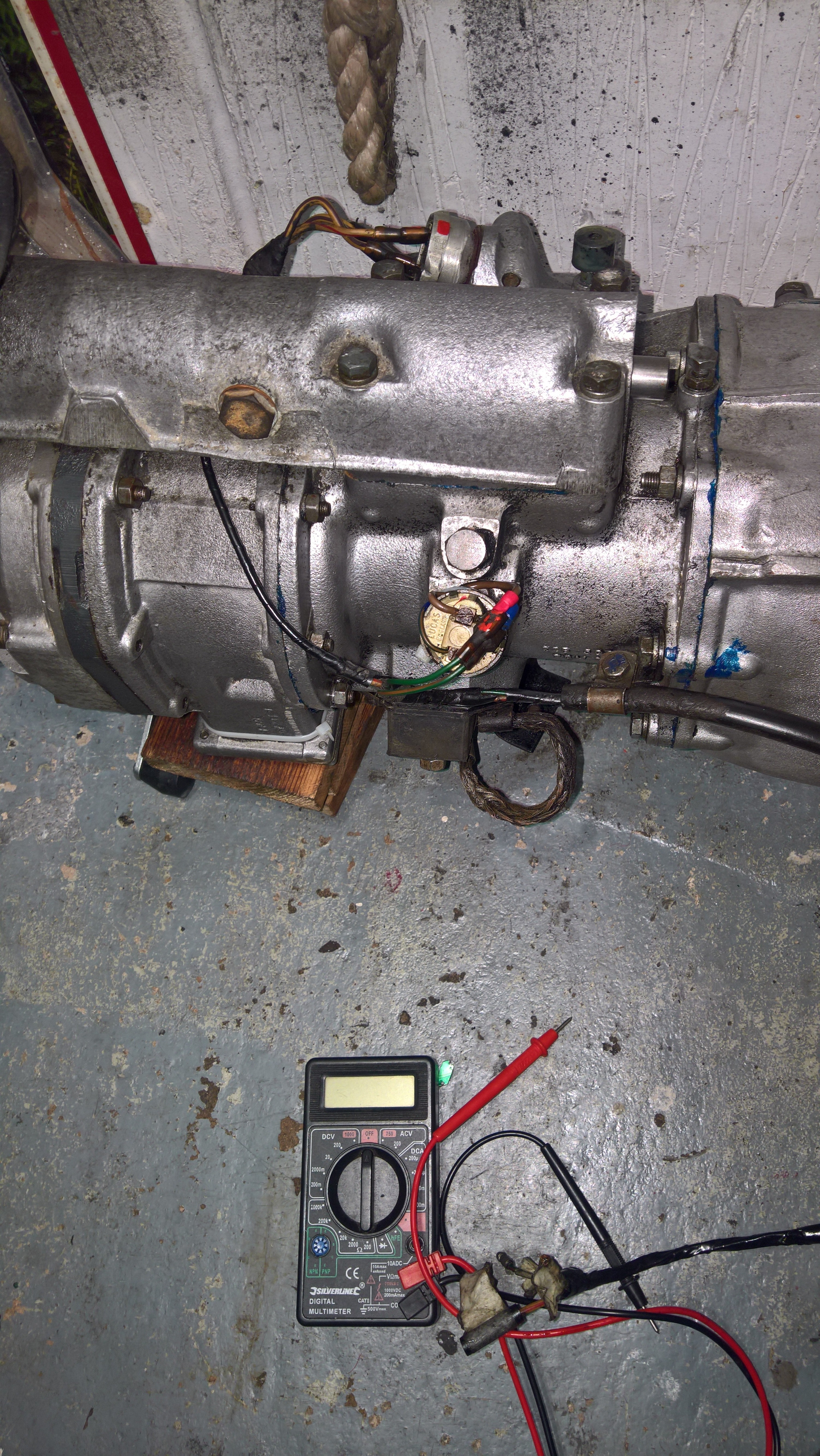 Having had the gearbox to bits (well – in a few bits) i want to be sure all the gearbox electrics are all working ok before it goes back in the car. There is a switch for the reversing lights and a switch for the overdrive both fed by an aging wiring loom. Had to refer to the wiring diagram to identify which of the 3 wires did what. The white/red stripe feeds the overdrive switch which after activating the overdrive solenoid goes to earth. The reversing switch is an on/off for the two green wires.