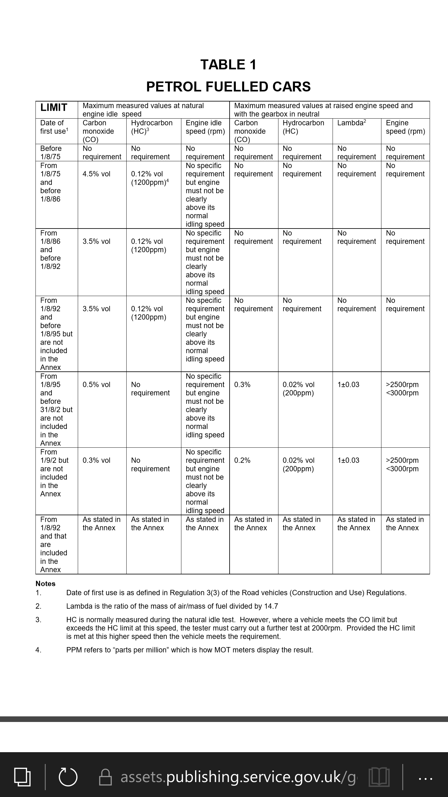 I found this info that relates to the mot emissions testing. Looks like pre 1975 motors are exempt after that it starts at 4.5% and gradually reduces until make and model settings take over.