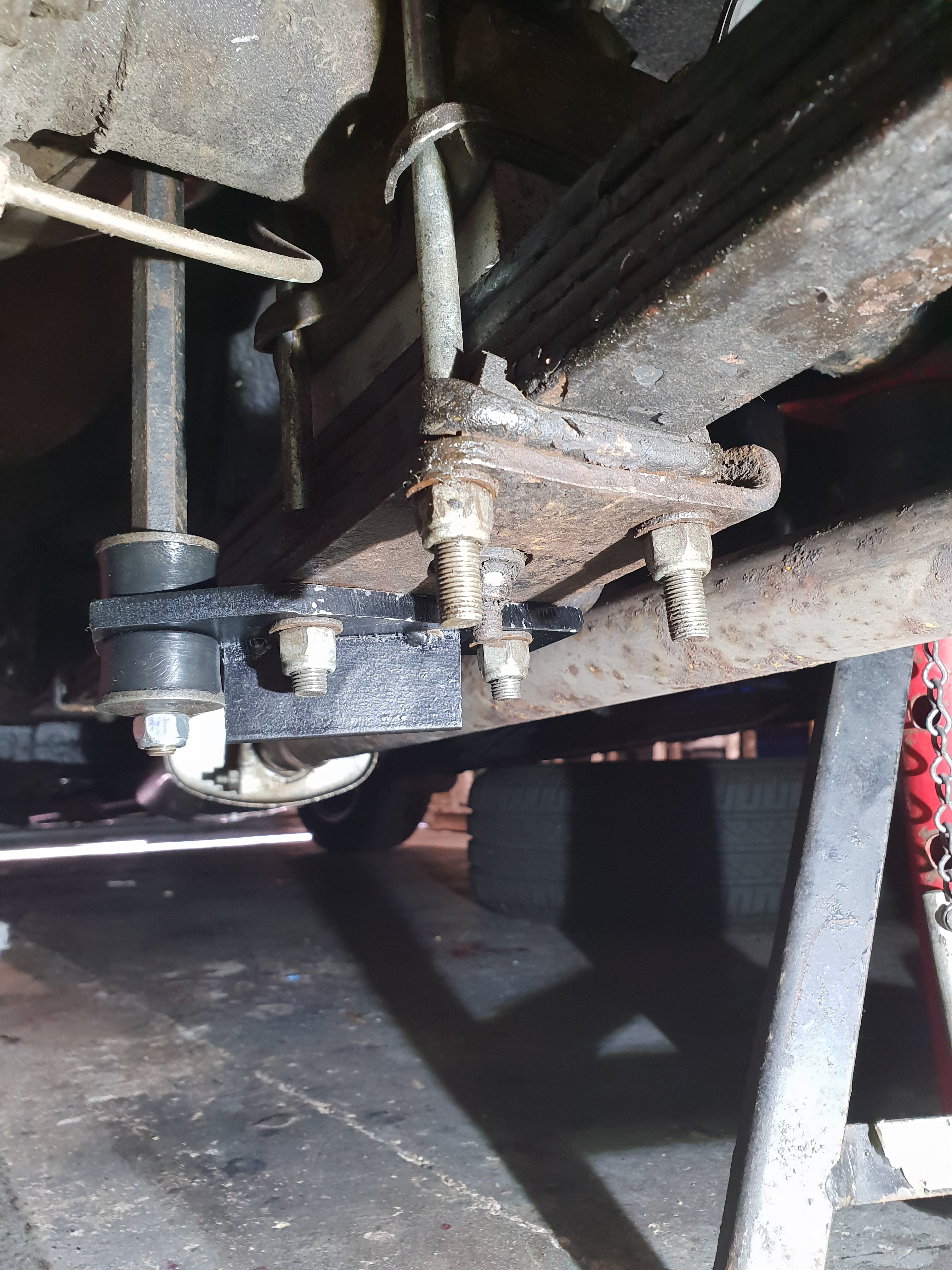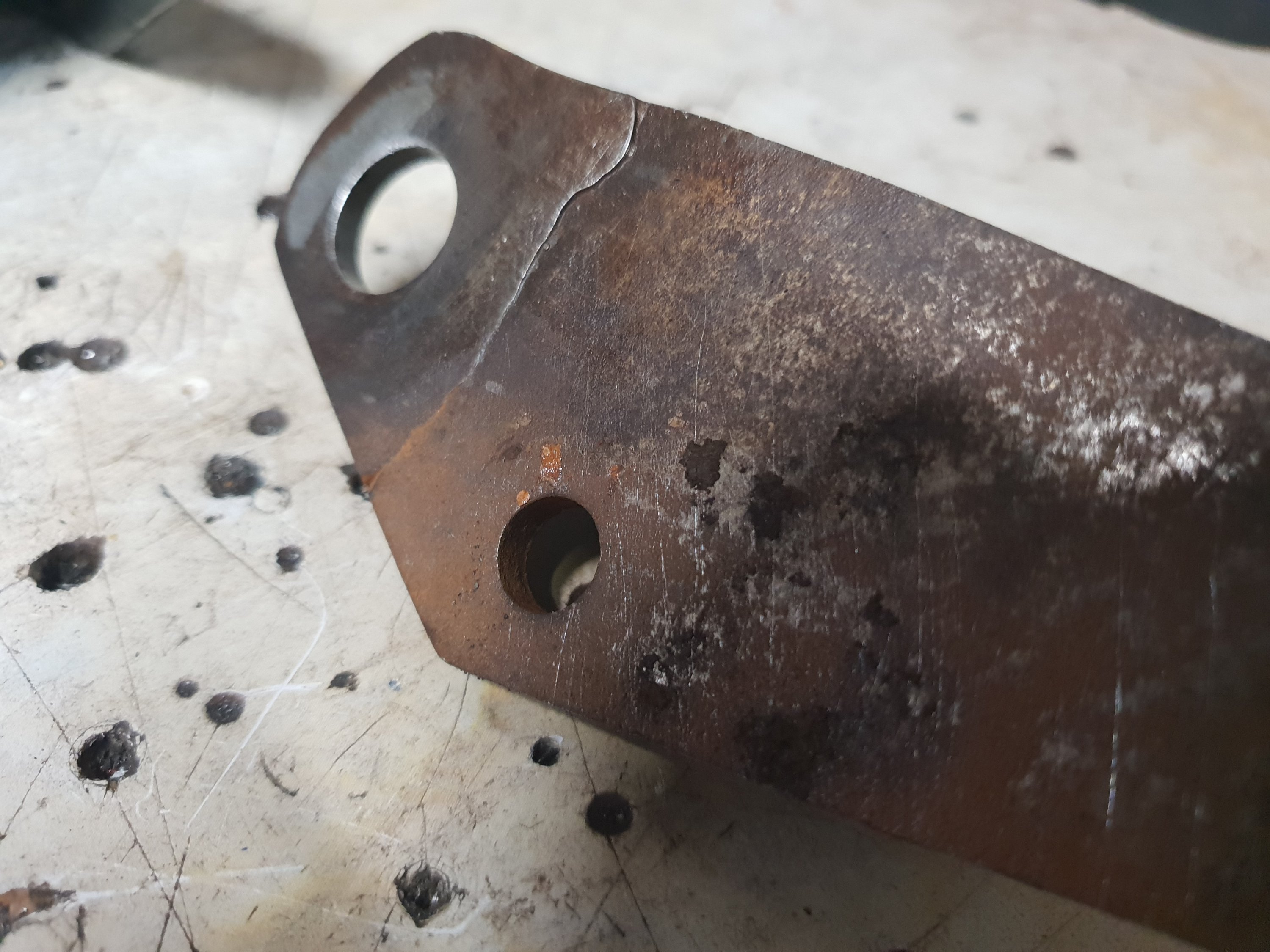 Anyway on fitting the lower brackets I noticed that they had been welded up as if the lugs had broken off (see top photo) which I was a bit unhappy about being a potential weakness. I bought some 8mm plate (instead of the original 5mm) and made some replacements. Because of the thicker plate I made the lower droplink hole 1mm bigger to maintain the same angular movement of the droplink from the ARB with the thicker plate.