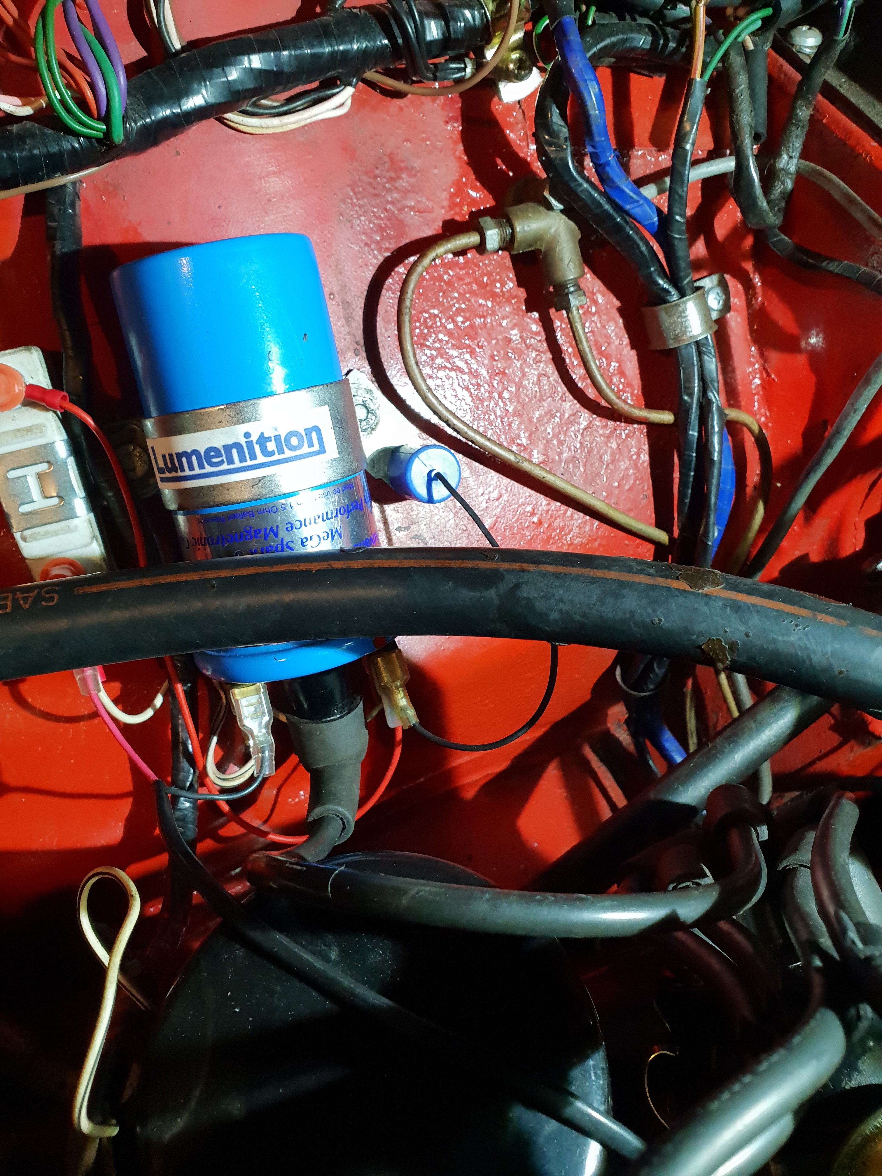 The alternator needs to be suppressed . I used a scotchlok to attach it to the correct wire leading into the alternator. Before anyone says that’s not period apparently according to Google they were invented in the 1960s. I can certainly remember using them in the 1980s.