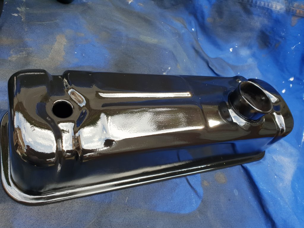 A fine warm day and so i thought a good day to paint – there was no wind so best outside. I had bought some black enamel spray ready. I used enamel as no primer is required and it is more hard wearing, ideal for an engine compartment. Also enamel is not so temperature dependant as normal car body spray – you get a good gloss even on pretty cold days.
