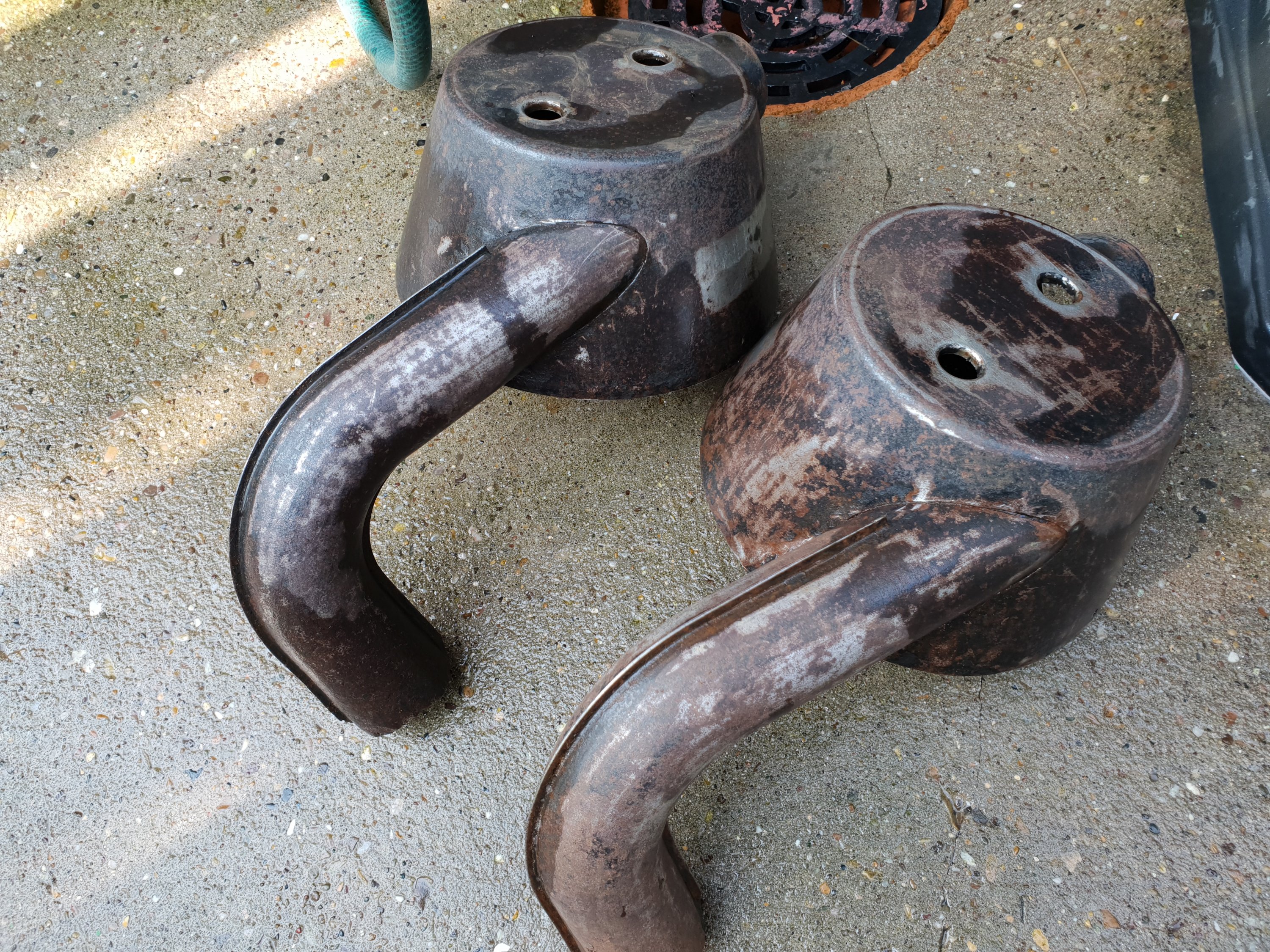 Started with removing all the crap paint. It must have been pretty old paint and it came off quite easy as it was very brittle using a flat chisel held at 90deg to the surface. A good rub down with some medium grade wet and dry got them ready to paint.
