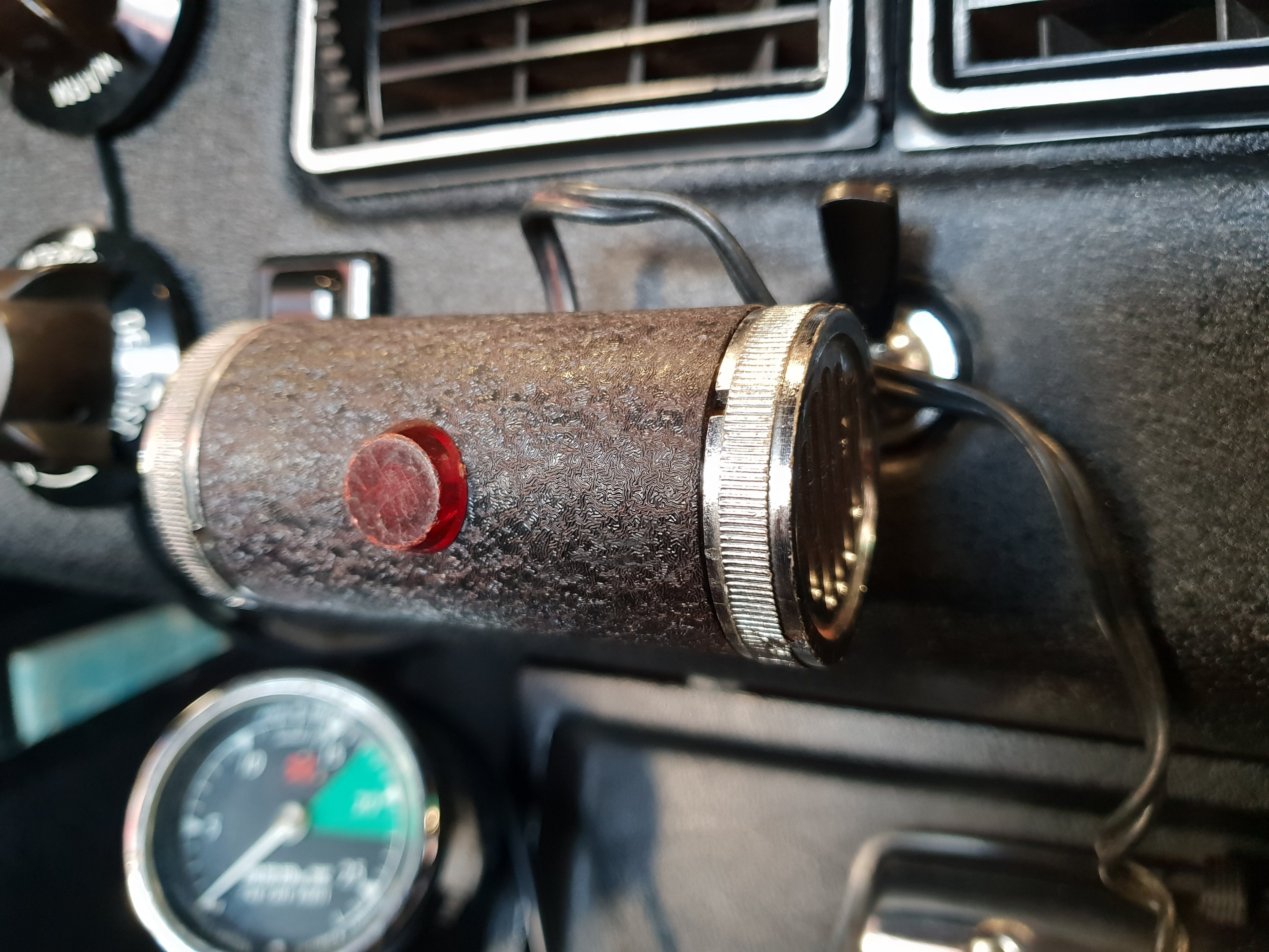 Its a cylindrical shape with a magnetic base which is ideal for attaching to the MG dash. It has chrome plated plastic end caps that pull off. There looks like some sort of heater element inside it so i guess it’s an early type of scent thing for a car. I’ve not plugged it in to the lighter socket yet and i don’t think i will – but it looks very “period” and certainly matches in well with the MGB dash.