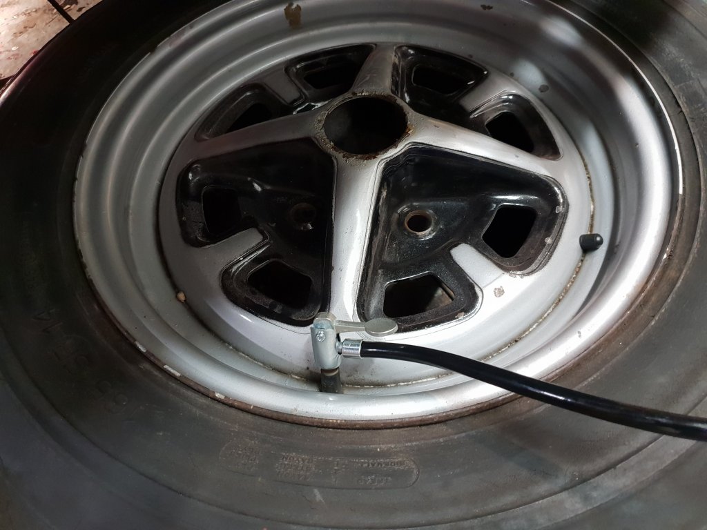 It uses air pressure from the spare tyre to push fluid from a pressurised bottle through the master cylinder and slave cylinder forcing out air on its way…….. well that’s the theory.
