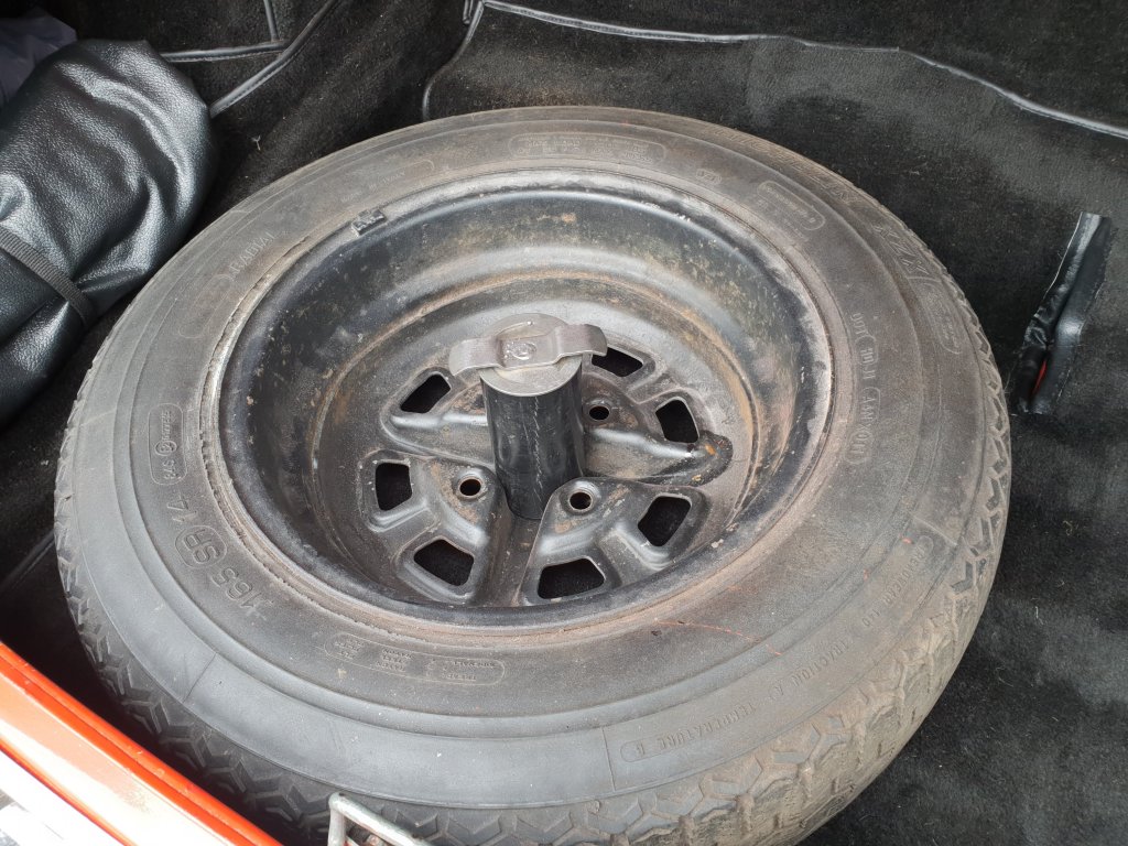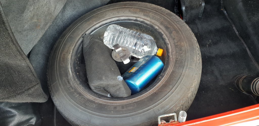 Putting things back in the boot it can be seen that a while ago i started storing the spare wheel up side down using a short length of drain pipe as a spacer for the clamping stud. This means i created a useful extra space for storage. I have a bottle of water, some oil and a pressurised puncture repair kit which is wrapped in felt to stop any rattling.