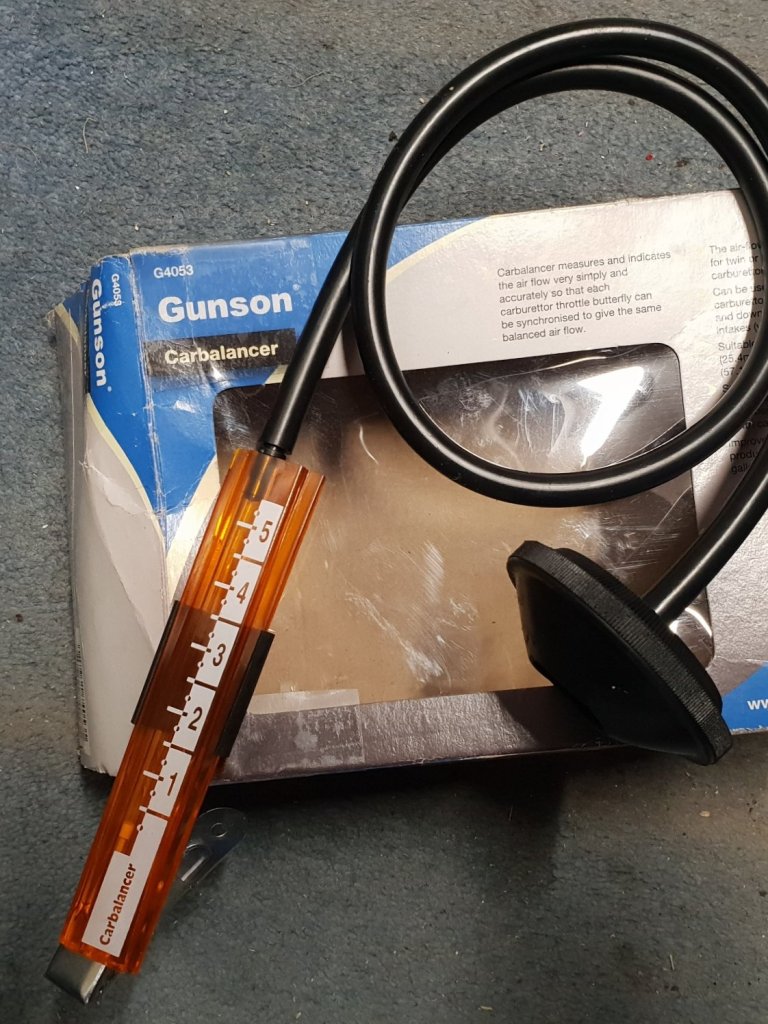 The nozzle, connected to the reader with a rubber pipe is moved from one carb inlet to the other and comparing the difference the ball in the reader “floats”. The tickover is adjusted on each carb until the readings / float height is the same for each carb.