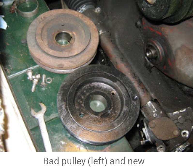 The harmonic balancer / crank pulley had separated from the rubber insert and that the outer part of the pulley was turning independent of the crank.