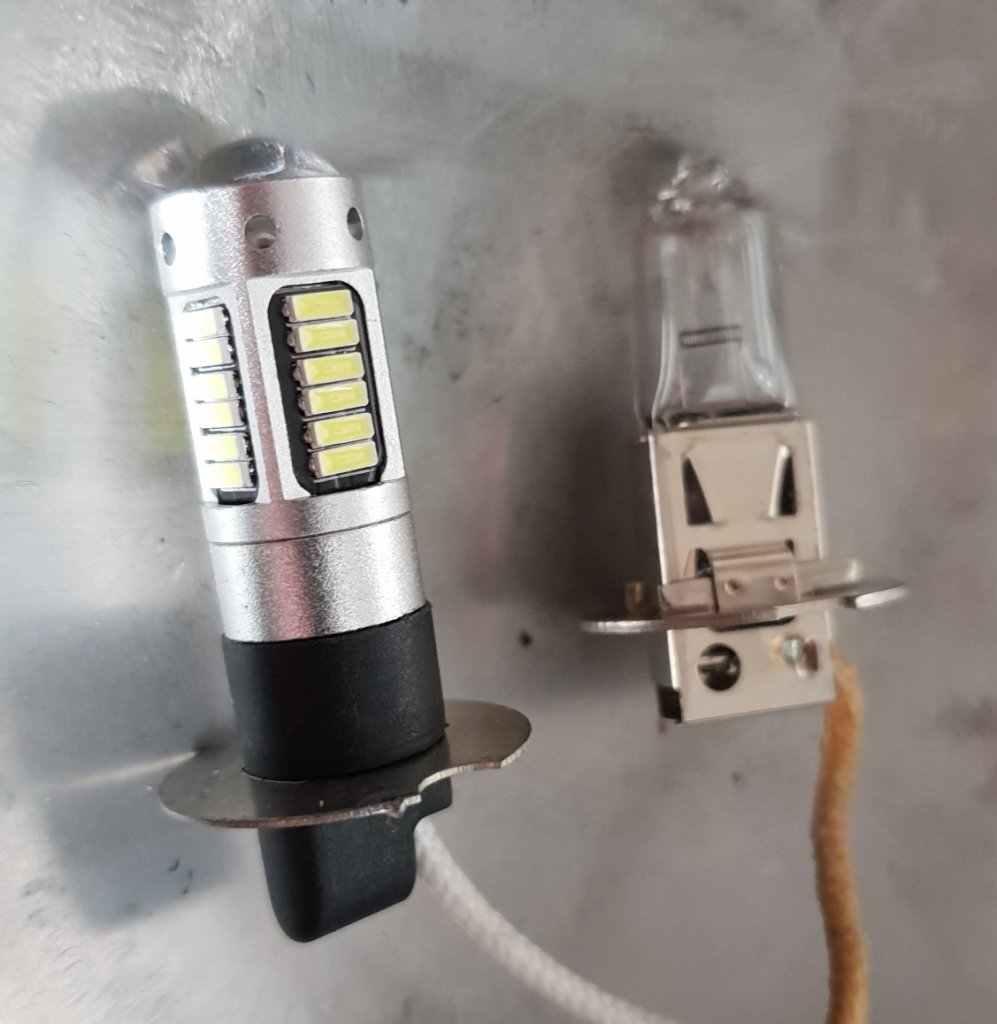 I have already replaced the 55w headlight bulbs with 40w led bulbs. Now replaced the 50w spotlight bulbs with 10w led bulbs. Many of the led type bulbs available are too long and hit the glass front – these bulbs were the shortest i could find (still longer than the originals) and fit well (you can find them on eBay).
