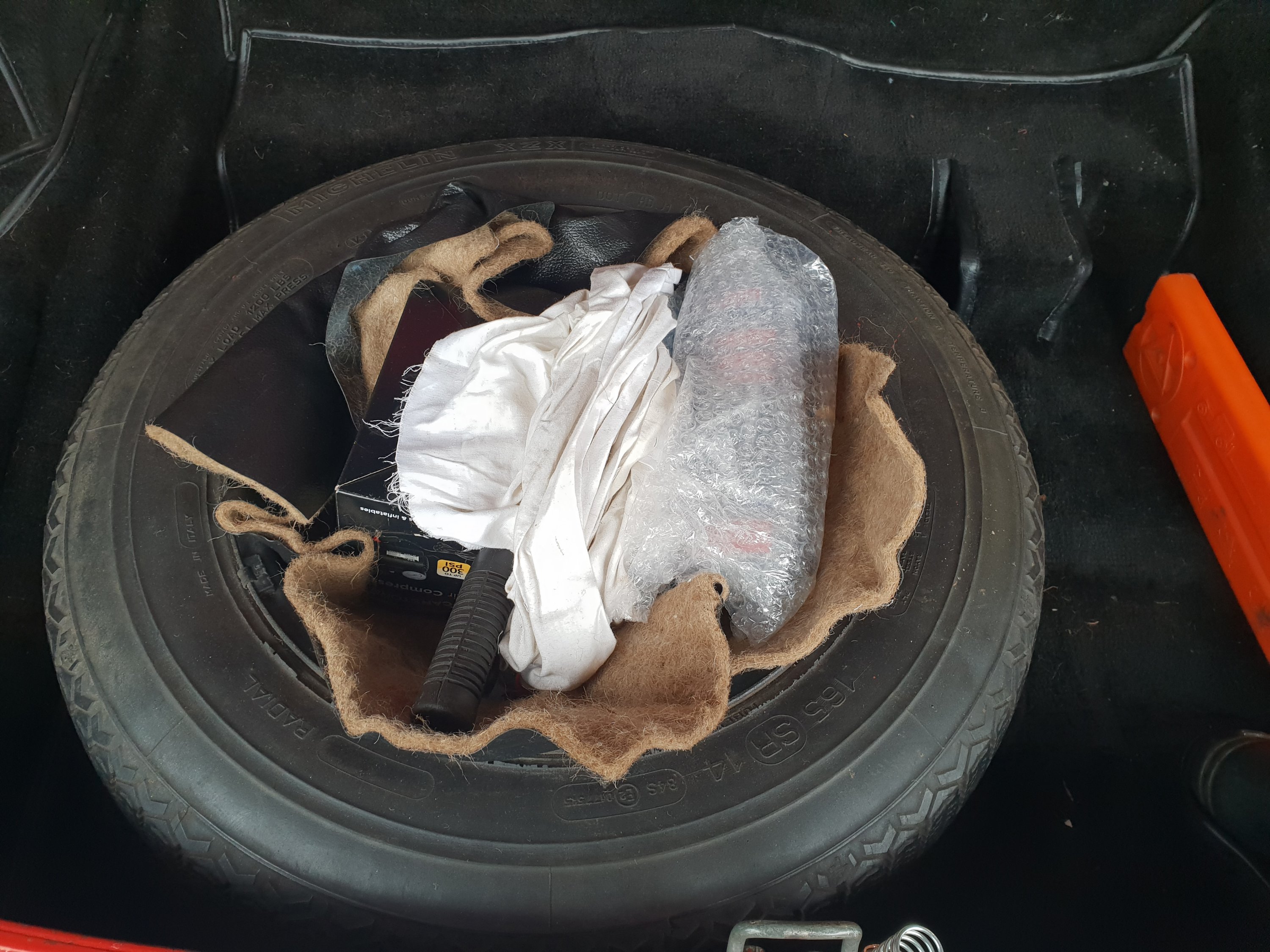 This meant I had some useful easily accessible storage space for the jack, handle, wheel spanner and air pump. I placed these within a piece of felt to prevent any metal to metal rattles.