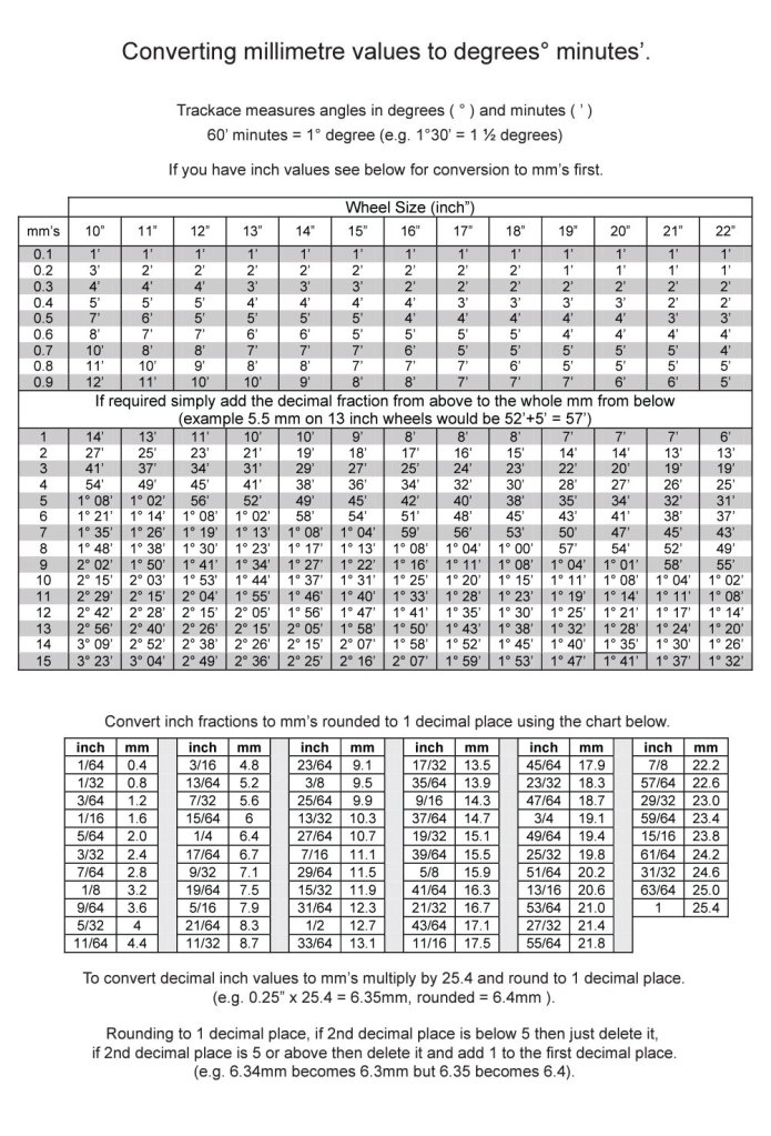 A handy chart to convert degrees and mm for toe in readings. All the MGB measurements I could find were given in mm across the wheel rim but my trakrite measured in mm.