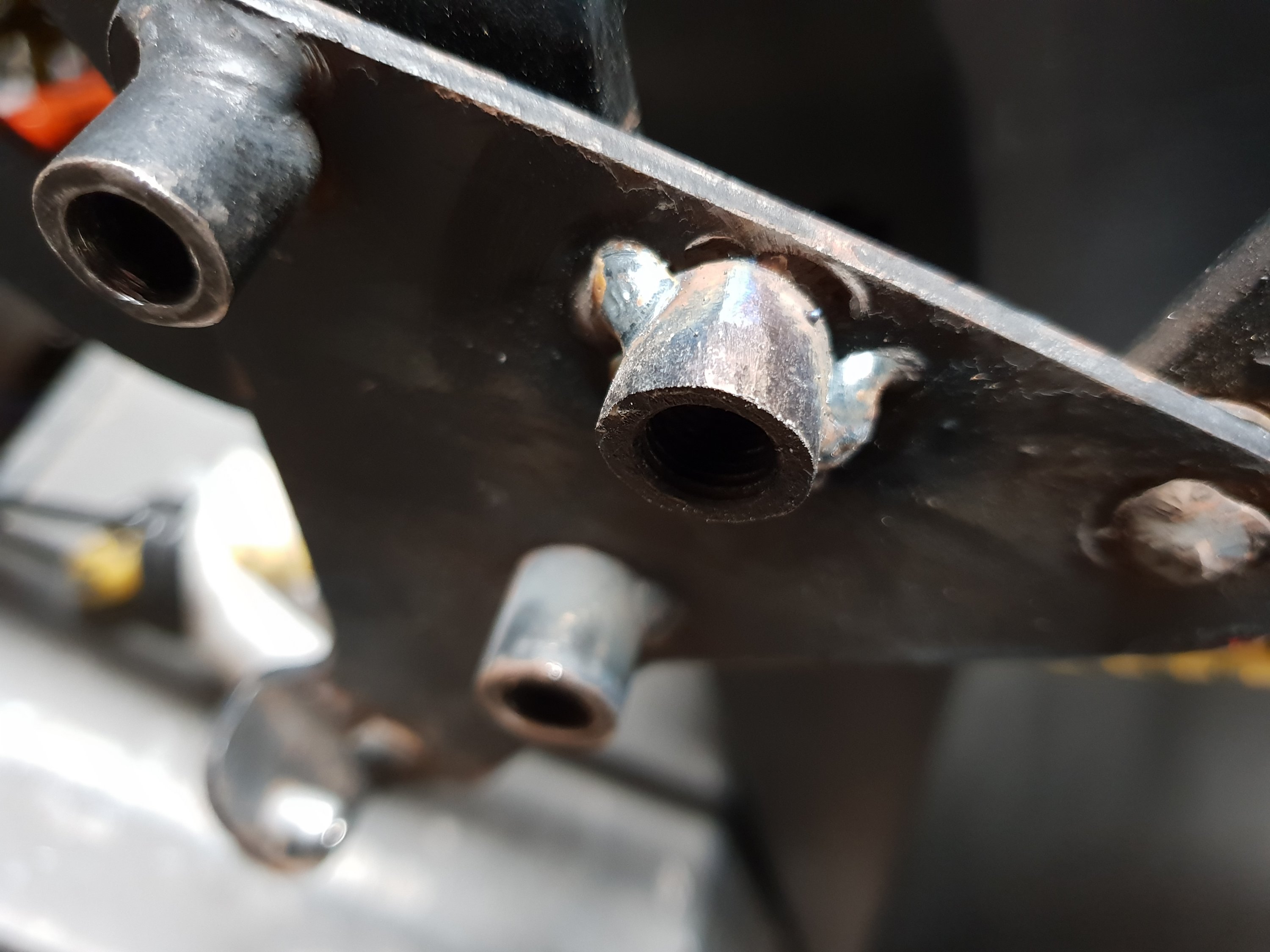 Not having any steel tube that size in my garage I found a suitable nut and filled it round to size and then welded it in to place. A bit of mat black paint and job done.