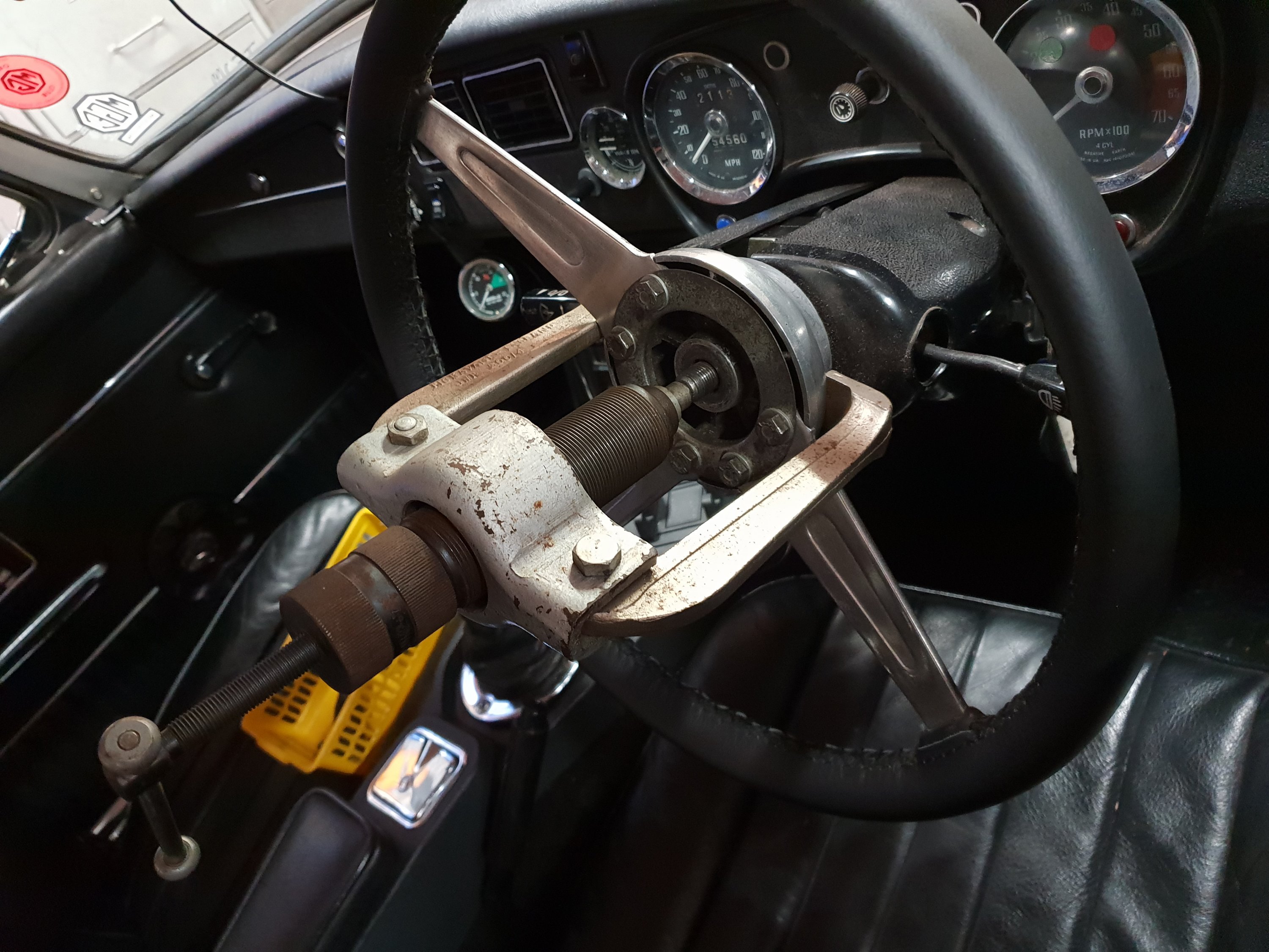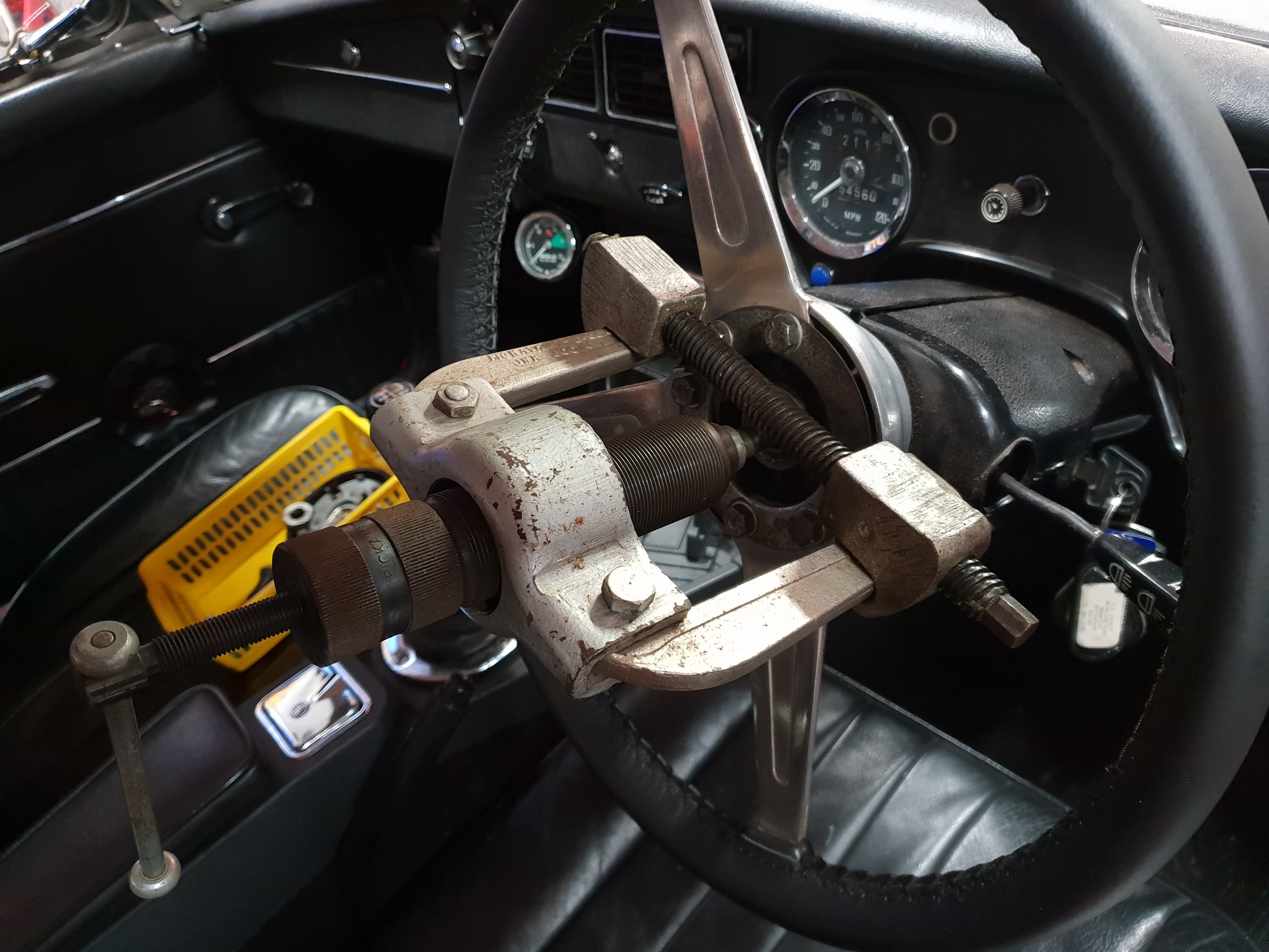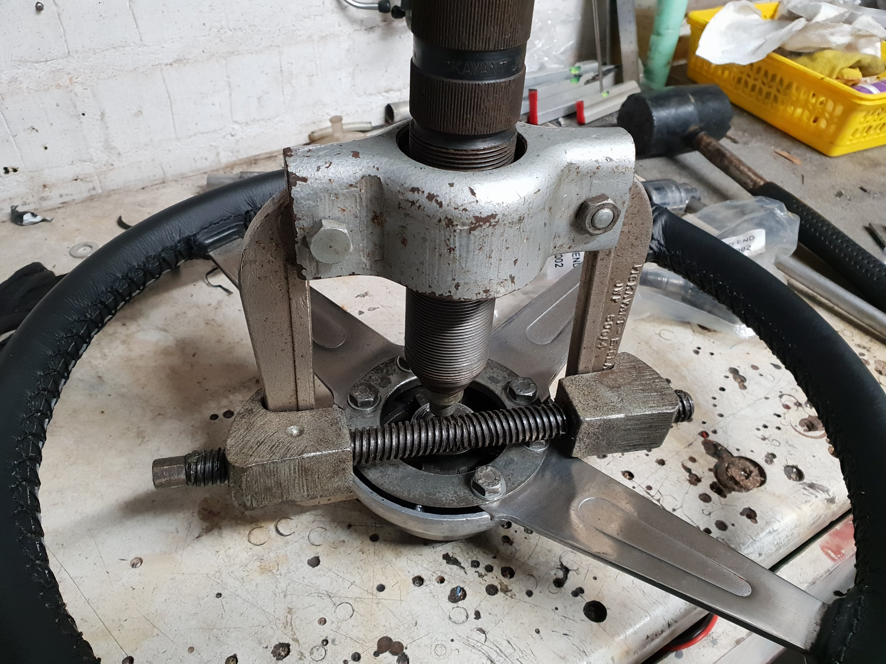 I recently acquired a “pull” that was being given away so after trying to remove the steering wheel to no avail decided it was a good time to give it a try. The next problem was that the back of the steering wheel hub is tapered so the grips kept slipping ….. until I attached a suspension spring compressor across the legs to stop them spreading. Job done and steering wheel popped off.